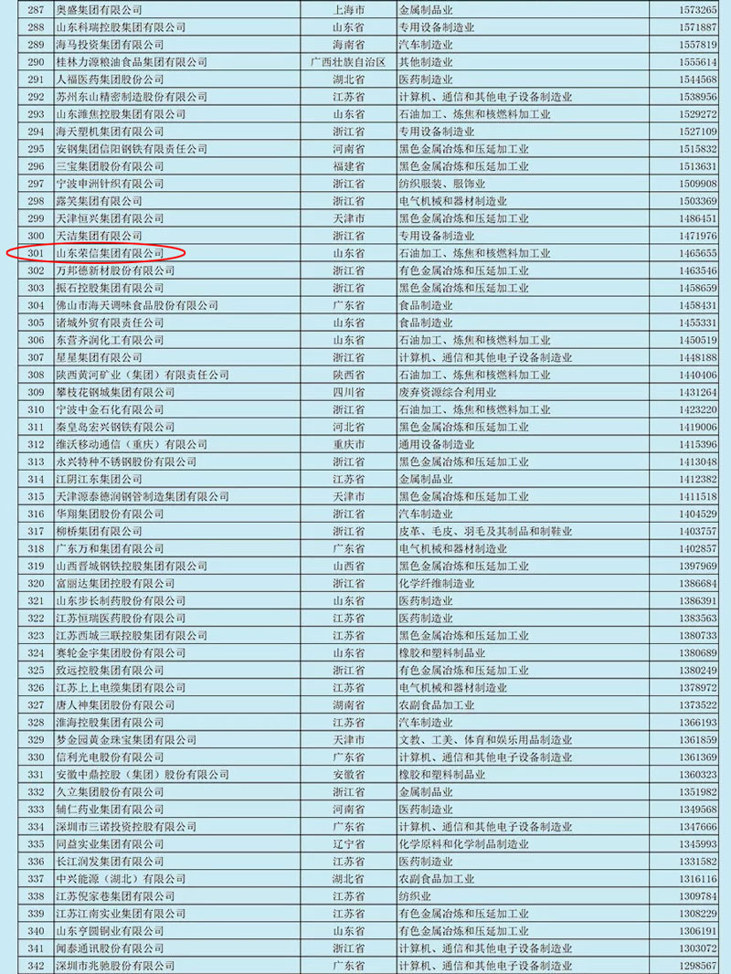 8月29日上午,由全國工商聯(lián)和遼寧省人民政府共同主辦的2018中國民營企業(yè)500強(qiáng)峰會在沈陽召開,會上發(fā)布了2018中國民營企業(yè)制造業(yè)500強(qiáng)名單。其中山東榮信集團(tuán)榜上有名,位居榜單第301位。這是繼公司建業(yè)以來先后于2014年、2015年、2017年榮獲該項(xiàng)榮譽(yù)之后的又一重大殊榮。