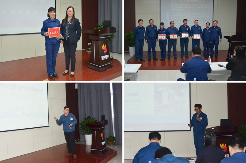 參選的QC課題緊緊圍繞生產(chǎn)技術(shù)改造、檢維修費(fèi)用縮減、環(huán)保設(shè)施升級(jí)等難題展開調(diào)研和改善。經(jīng)過(guò)講演人員的細(xì)致解說(shuō),評(píng)審小組對(duì)各項(xiàng)成果進(jìn)行現(xiàn)場(chǎng)點(diǎn)評(píng)。最終,動(dòng)力分廠發(fā)布的《提高加壓式溶氣氣浮除油率》、恒信科技發(fā)布的《提高產(chǎn)品精制的生產(chǎn)能力》斬獲一等獎(jiǎng),備煤分廠發(fā)布的《縮短細(xì)粉碎機(jī)開車時(shí)間》等QC課題榮獲二等獎(jiǎng),甲醇分廠講解人常慶英獲得“最佳發(fā)表人”獎(jiǎng)。