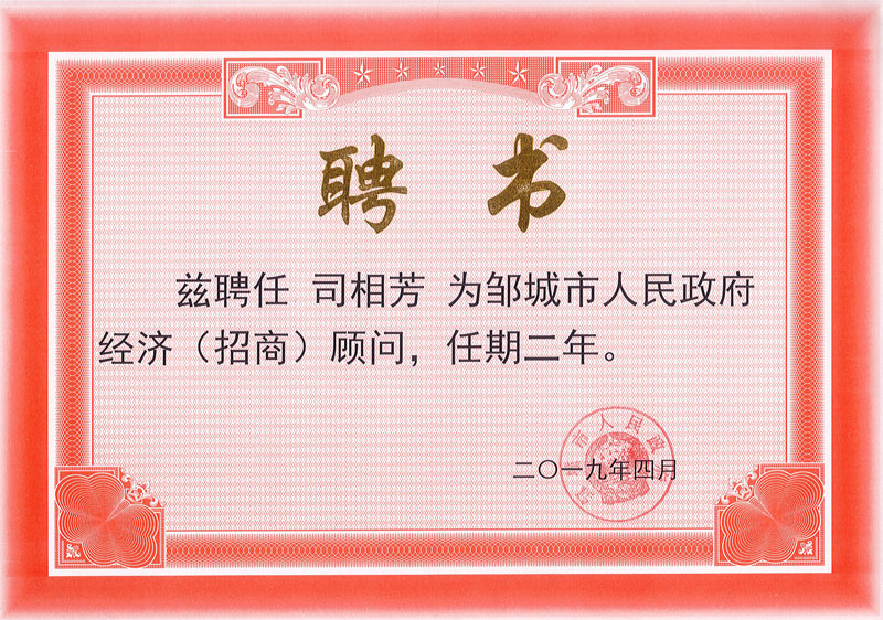 4月24日上午,鄒城市民營經(jīng)濟(jì)發(fā)展大會召開。山東榮信集團(tuán)司相芳總經(jīng)理被聘請為鄒城市人民政府經(jīng)濟(jì)(招商)顧問,并作表態(tài)發(fā)言。