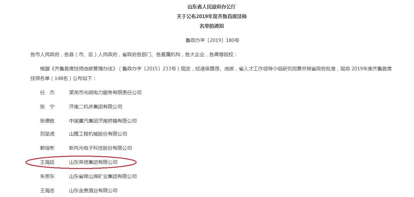 日前,山東省政府辦公廳發(fā)布《關(guān)于公布2019年度齊魯首席技師名單的通知》,共選出148名2019年度齊魯首席技師。集團(tuán)選拔推薦的動力分廠廠長王海廷成功入選。